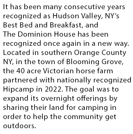 It has been many consecutive years recognized as Hudson Valley, NY's Best Bed and Breakfast, and The Dominion House has been recognized once again in a new way. Located in southern Orange County NY, in the town of Blooming Grove, the 40 acre Victorian horse farm...